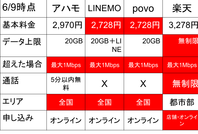 今回は、マイネオと楽天モバイルの比較投稿ですので、他社はざっくり解説です。