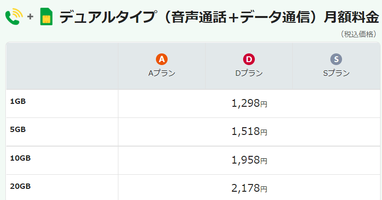 例えば、音声通話+データ通信の1GBプランなら、月額1,298円(税込み)です。