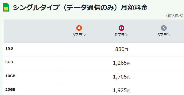 データ通信のみの方なら、1GBプランなら、月額880円(税込み)です。